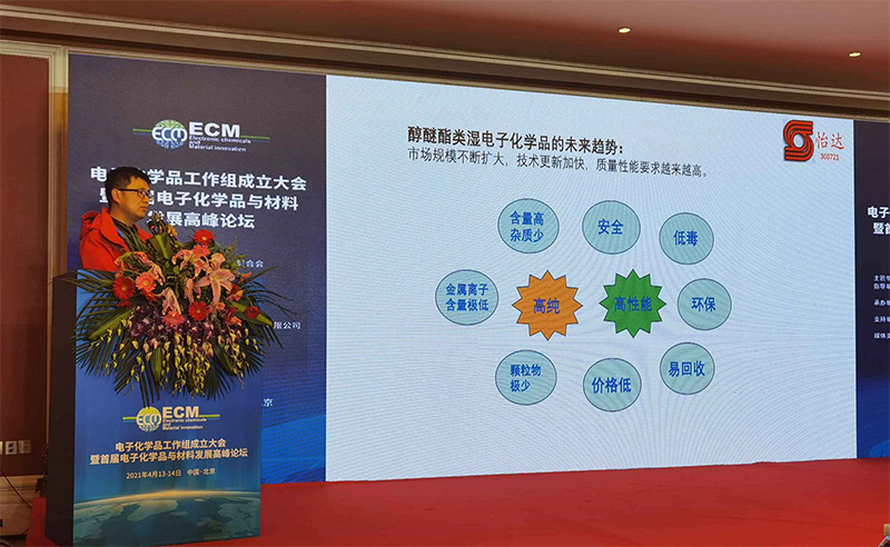 在首屆電子化學(xué)品與材料發(fā)展高峰論壇上,我公司研發(fā)一部劉涌同志做了精彩學(xué)術(shù)報(bào)告,《醇醚及其醇醚酯類濕電子化學(xué)品的應(yīng)用與展望》。講述了醇醚及其醇醚酯類濕電子化學(xué)品在溶劑類濕電子化學(xué)品中的應(yīng)用,其用于半導(dǎo)體、太陽能硅片、LED和平板顯示等電子元器件的光刻、清洗和蝕刻等工藝環(huán)節(jié)。具有技術(shù)門檻高、資金投入大、產(chǎn)品更新?lián)Q代快等特點(diǎn)。及該類產(chǎn)品的較大的應(yīng)用市場,主要包括二乙二醇甲醚醚、乙二醇丁醚、二乙二醇丁醚、丙二醇甲醚、丙二醇甲醚醋酸酯等。是微電子、光電子濕法工藝制程中使用的電子化工材料。