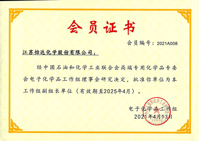 江蘇怡達(dá)被評為高端專用電子化學(xué)品組副組長單位